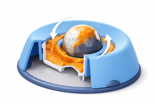 The ball sits freely in the bowl and rotates as your dog licks it. Every rotation exposes a freshly coated surface, so your dog always has a new layer of treat to lick. This extends sessions 4–10x longer than a flat lick mat that gets cleaned in minutes